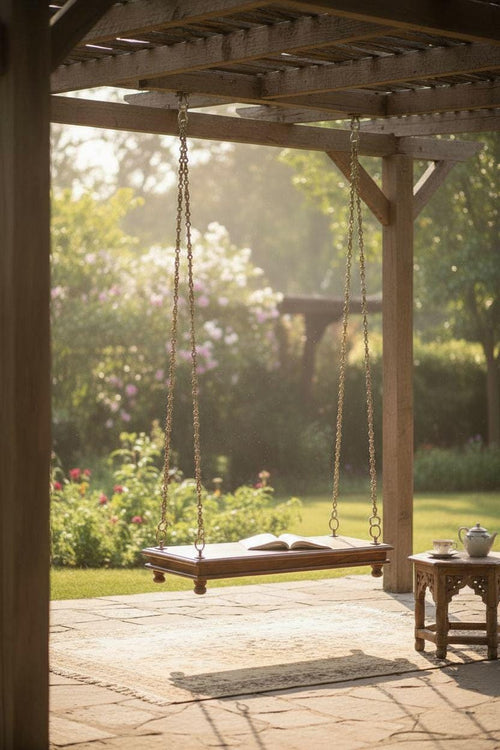 Carved Teak Wood Jhula Swing with Brass Chain: Indian Style Love Chair